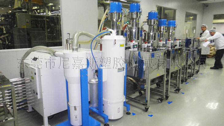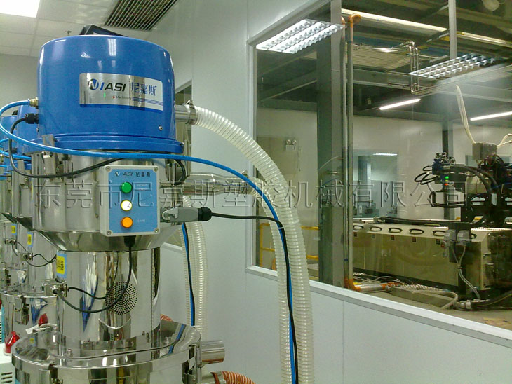 中央供料系統(tǒng)采用真空傳送方式,通過(guò)集中的管路系統(tǒng)將塑料原料從儲(chǔ)料罐輸送到中央除濕干燥系統(tǒng),然后將干燥后的原料輸送到每臺(tái)注塑機(jī)中。中央供料系統(tǒng)采用“一臺(tái)機(jī)器一根管”的設(shè)計(jì)方式,保證整個(gè)系統(tǒng)的空氣對(duì)原料進(jìn)行輸送,防止除濕干燥后的原料回潮。同時(shí)在每個(gè)輸運(yùn)行穩(wěn)定,絕無(wú)堵料的現(xiàn)象發(fā)生。它配合中央除濕干燥系統(tǒng)使用,可使用除濕干燥送循環(huán)后會(huì)對(duì)輸送管線進(jìn)行清理,確保管路內(nèi)沒(méi)有殘余的粒料,在避免原料回潮的同時(shí),也保證了加入注塑機(jī)中的原料性能的一致。在真空負(fù)壓作用下原料中原由的粉塵會(huì)通過(guò)粉塵過(guò)濾系統(tǒng)被過(guò)濾出來(lái),有助于提高成型產(chǎn)品的質(zhì)量。