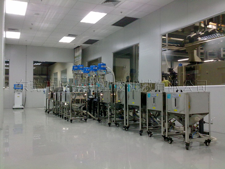 中央供料系統(tǒng)是根據(jù)客戶現(xiàn)場(chǎng)機(jī)臺(tái)的擺放情況對(duì)現(xiàn)場(chǎng)原料的用料情況,結(jié)合特有輔機(jī)設(shè)計(jì)備而設(shè)計(jì)的一種能夠?qū)崿F(xiàn)集中供料、集中控制,從而實(shí)現(xiàn)全廠無(wú)人化不間斷成型作業(yè)的整體性解決方案。