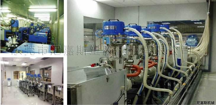 中央供料系統(tǒng)是根據(jù)客戶現(xiàn)場機臺的擺放情況對現(xiàn)場原料的用料情況,結(jié)合特有輔機設(shè)計備而設(shè)計的一種能夠?qū)崿F(xiàn)集中供料、集中控制,從而實現(xiàn)全廠無人化不間斷成型作業(yè)的整體性解決方案。