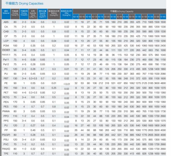 選購(gòu)料斗干燥機(jī)、熱風(fēng)干燥機(jī)、塑料干燥機(jī)時(shí)請(qǐng)參照以下烘干時(shí)間來采購(gòu)合適配置注塑機(jī)型號(hào)的干燥機(jī)