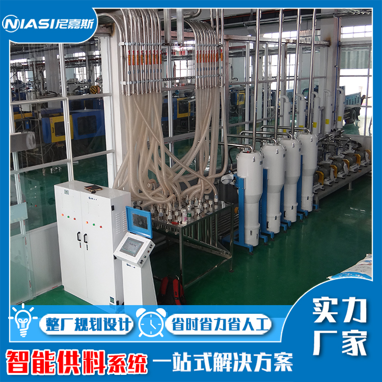 2). 在車間每臺成型機處,設(shè)置一選料防錯觸摸屏(操作終端),在該屏上顯示當(dāng)前料房的儲料桶和干燥桶的儲料信息,并顯示中控臺上該臺機的原料選擇信息。機臺操作員必須在終端觸摸屏再次輸入該機臺的原料物料碼,或者通過掃碼槍掃碼輸入,如果終端和中控臺的輸入一致,則系統(tǒng)將允許該機臺進行吸料,如果不同,系統(tǒng)發(fā)出報警提示,并禁止該機臺自動吸料。